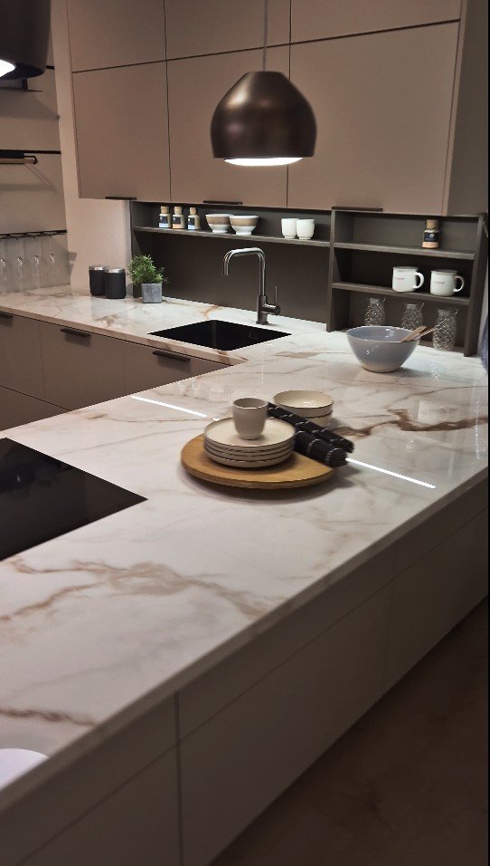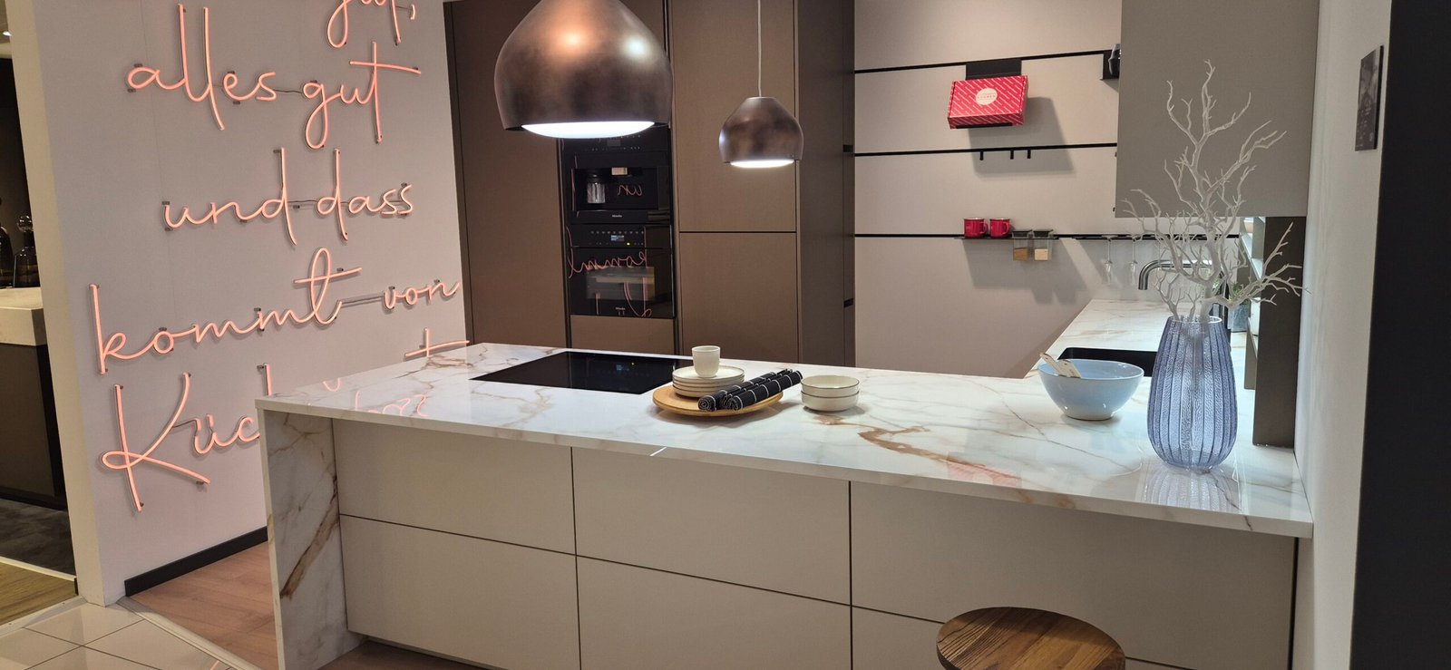 Diese Ausstellungsküche wurde in Hannover präsentiert und zeigt aktuelle Trends im Premium-Küchendesign. Die Kombination aus moderner Ästhetik und funktionalen Details schafft eine perfekte Balance zwischen Design und Alltagstauglichkeit.