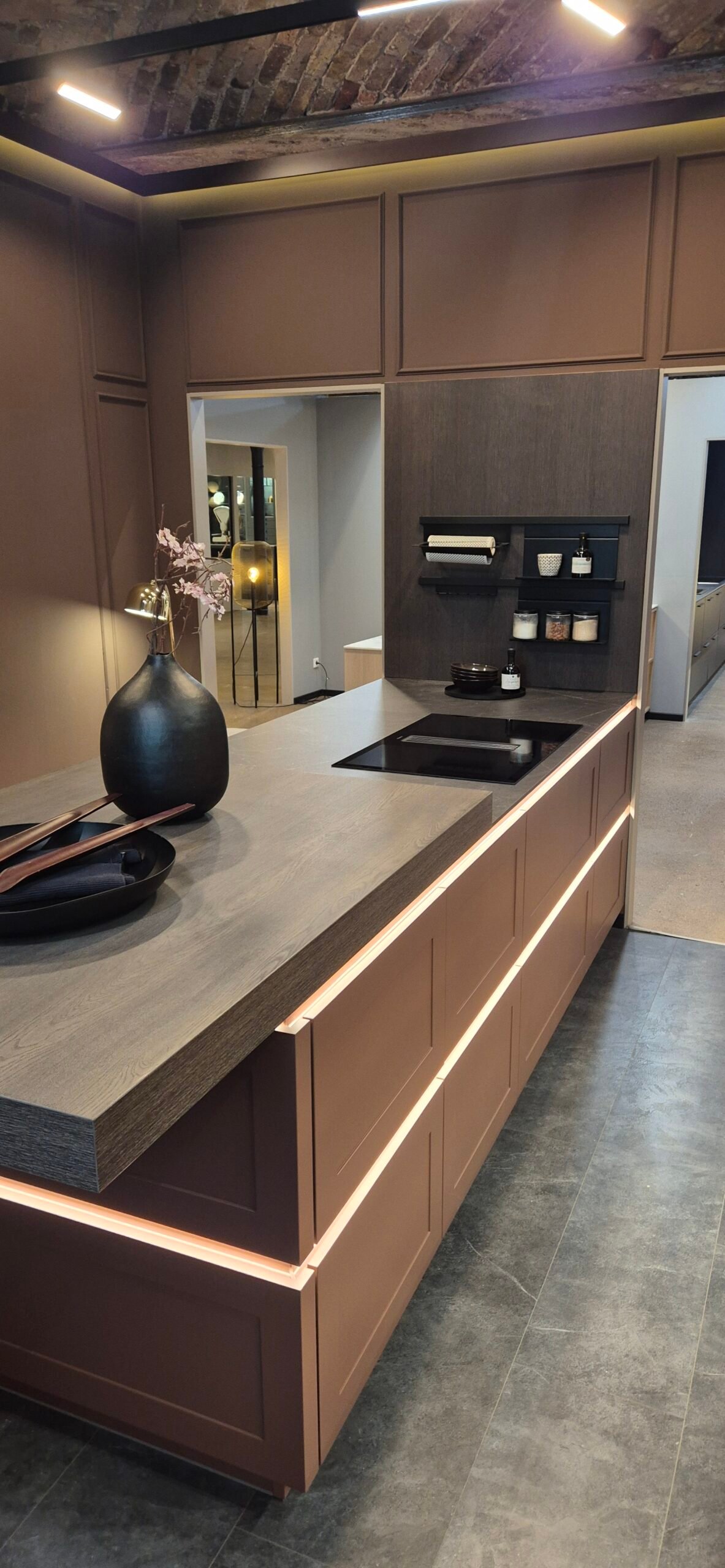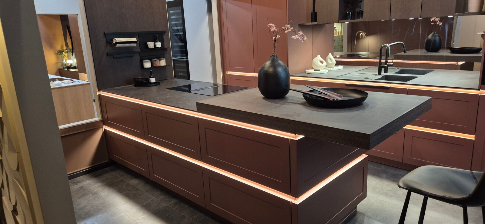 Diese Ausstellungsküche wurde in Hannover präsentiert und zeigt aktuelle Trends im Bereich moderner Designküchen. Die Kombination aus kräftigen Farbtönen und natürlichen Materialien schafft eine besondere Atmosphäre und macht die Küche zu einem echten Blickfang.