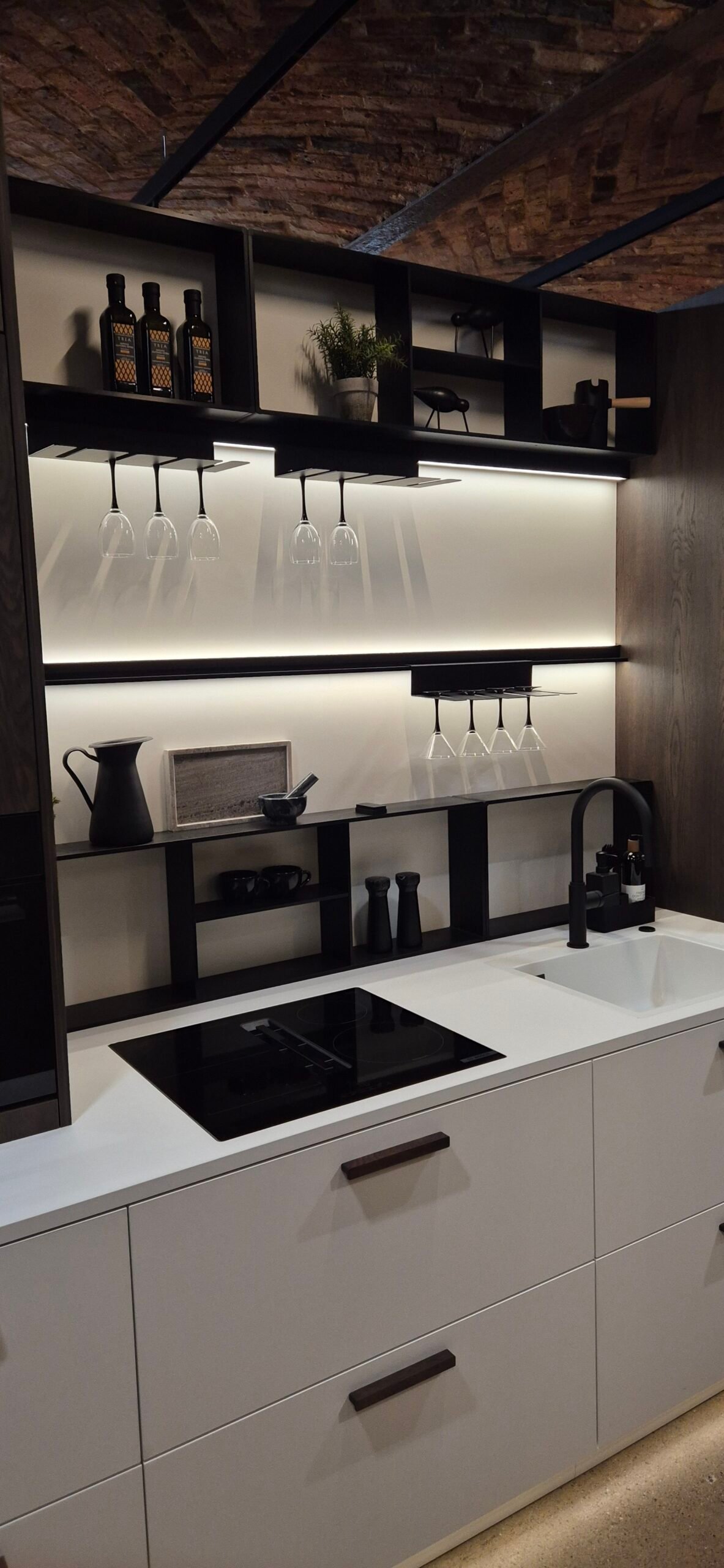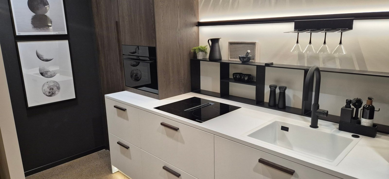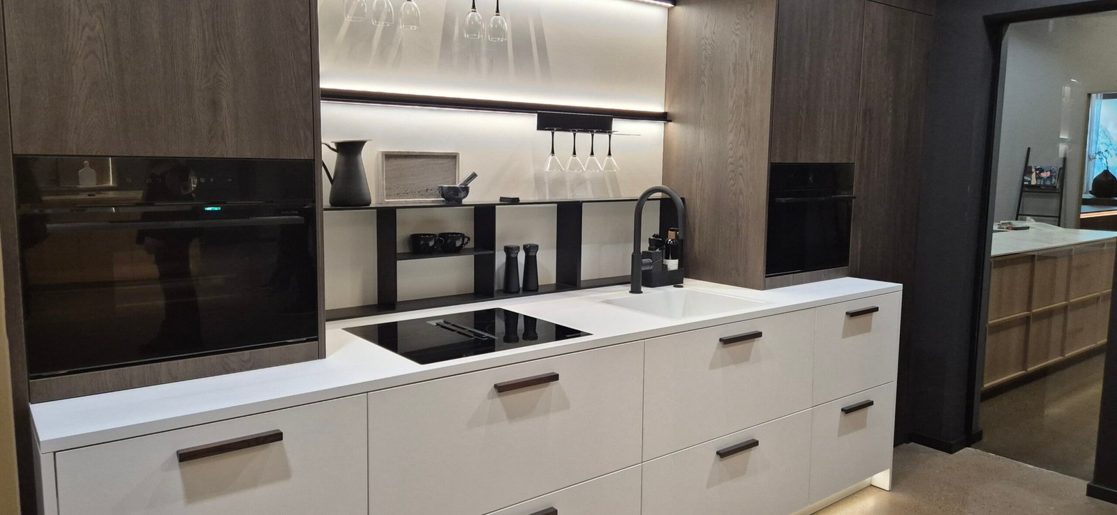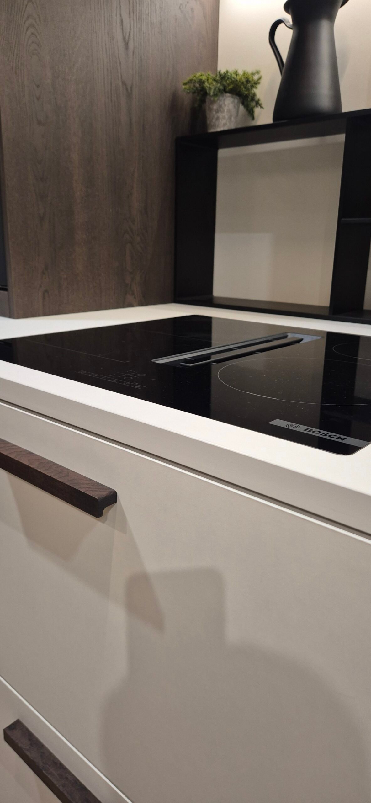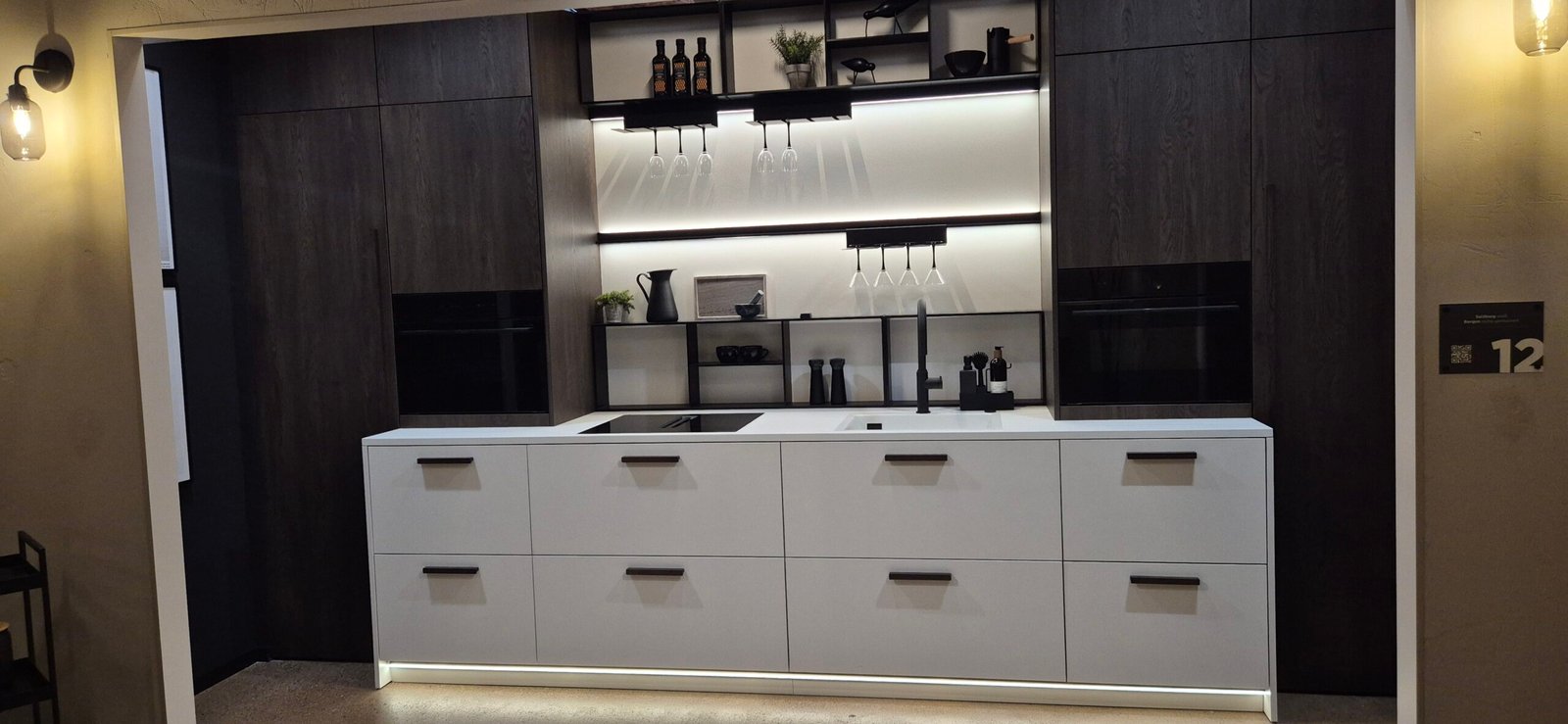 Diese Ausstellungsküche wurde in Hannover präsentiert und zeigt aktuelle Trends im Bereich moderner Küchen mit Holzoptik. Die Kombination aus Weiß und dunkler Holzstruktur schafft ein stilvolles und ausgewogenes Gesamtbild.