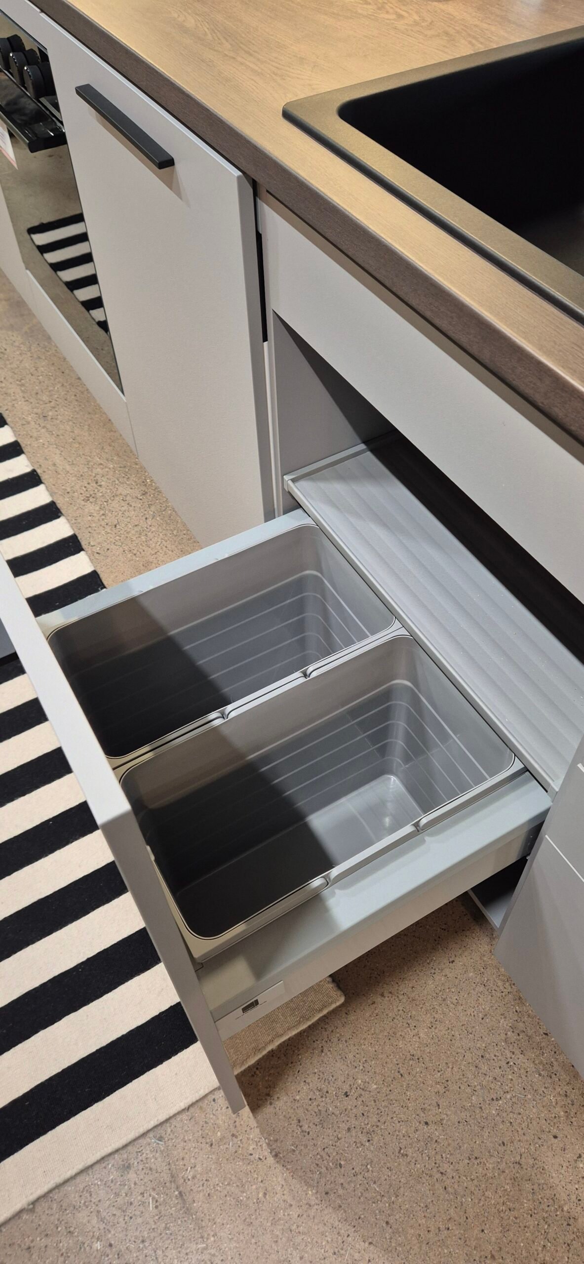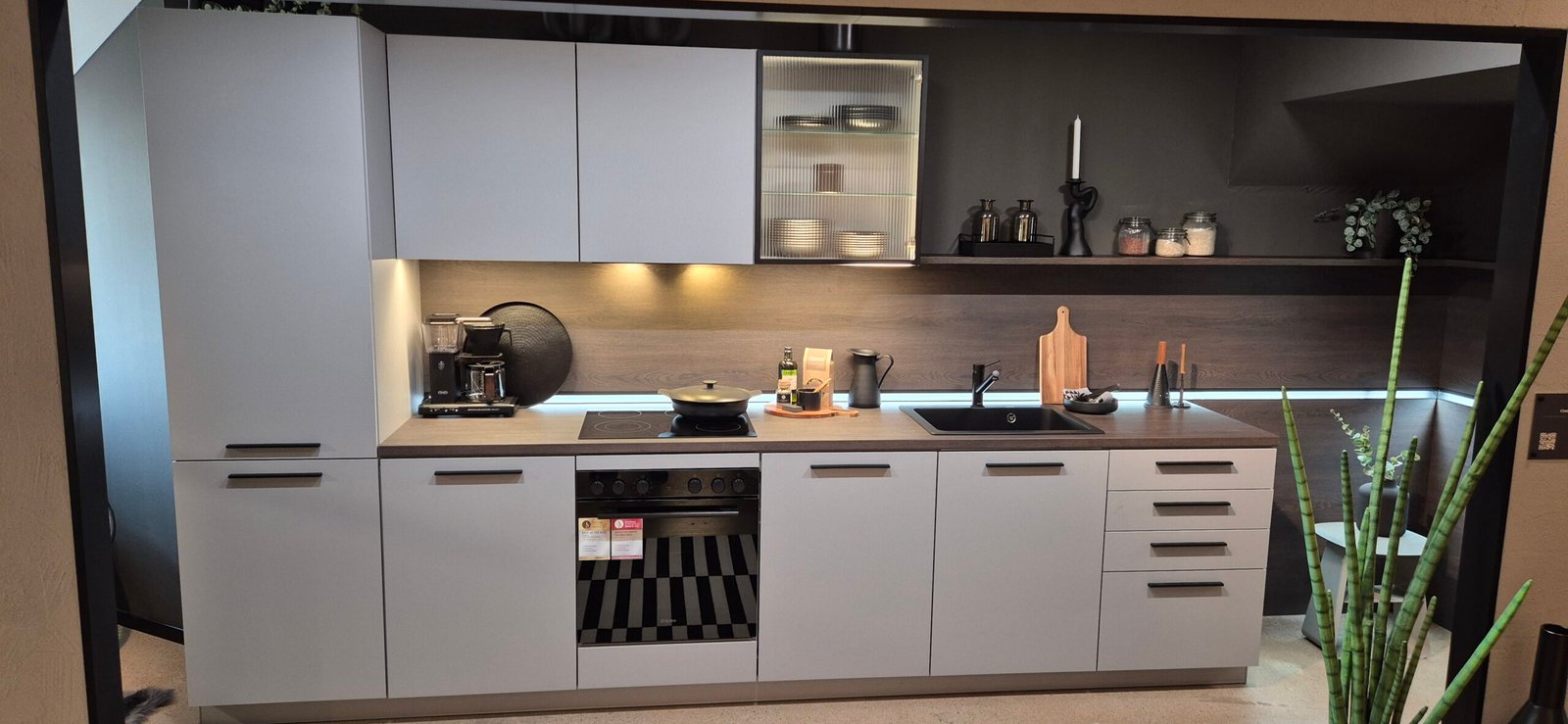 Moderne Burger Ausstellungsküche Cindy in Nebelgrau. Zeitloses Design in eleganten Grautönen – ideal für stilvolle Küchen in Hannover und Laatzen.