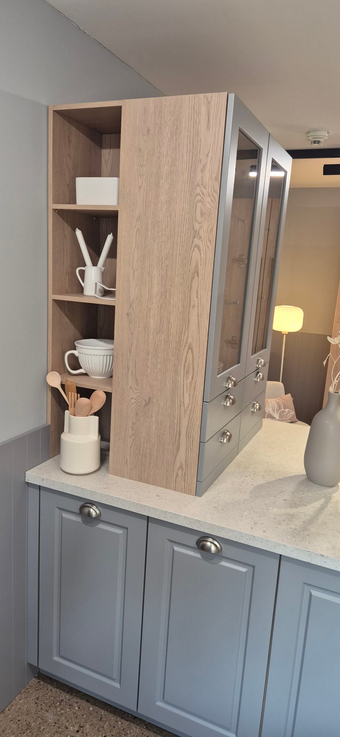 Moderne Burger Ausstellungsküche Mara in Nebelgrau mit Marie Eiche Hell. Harmonische Kombination aus kühlen und warmen Tönen – ideal für stilvolle Küchen in Hannover und Laatzen.