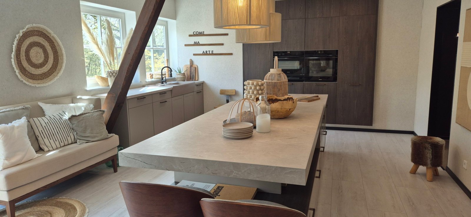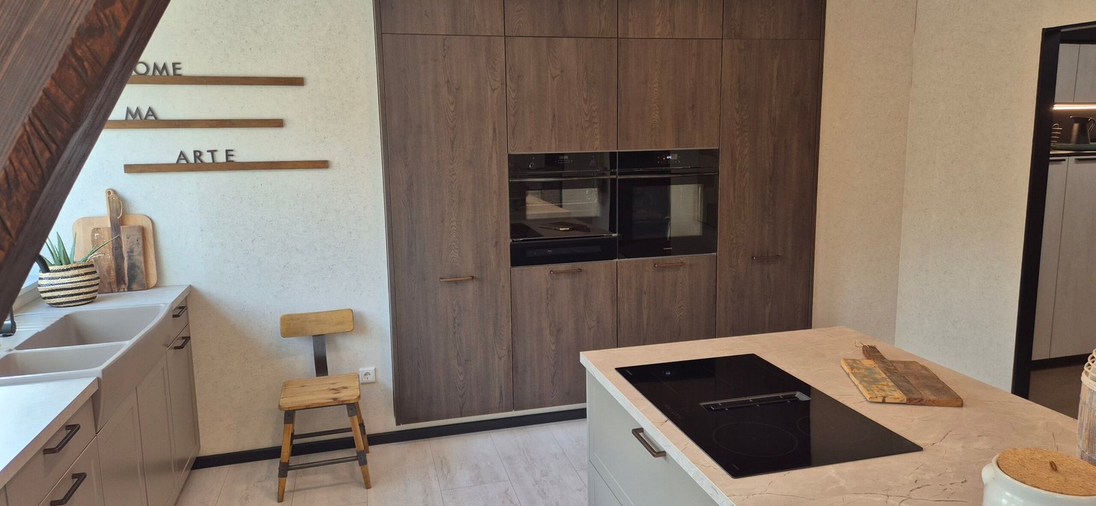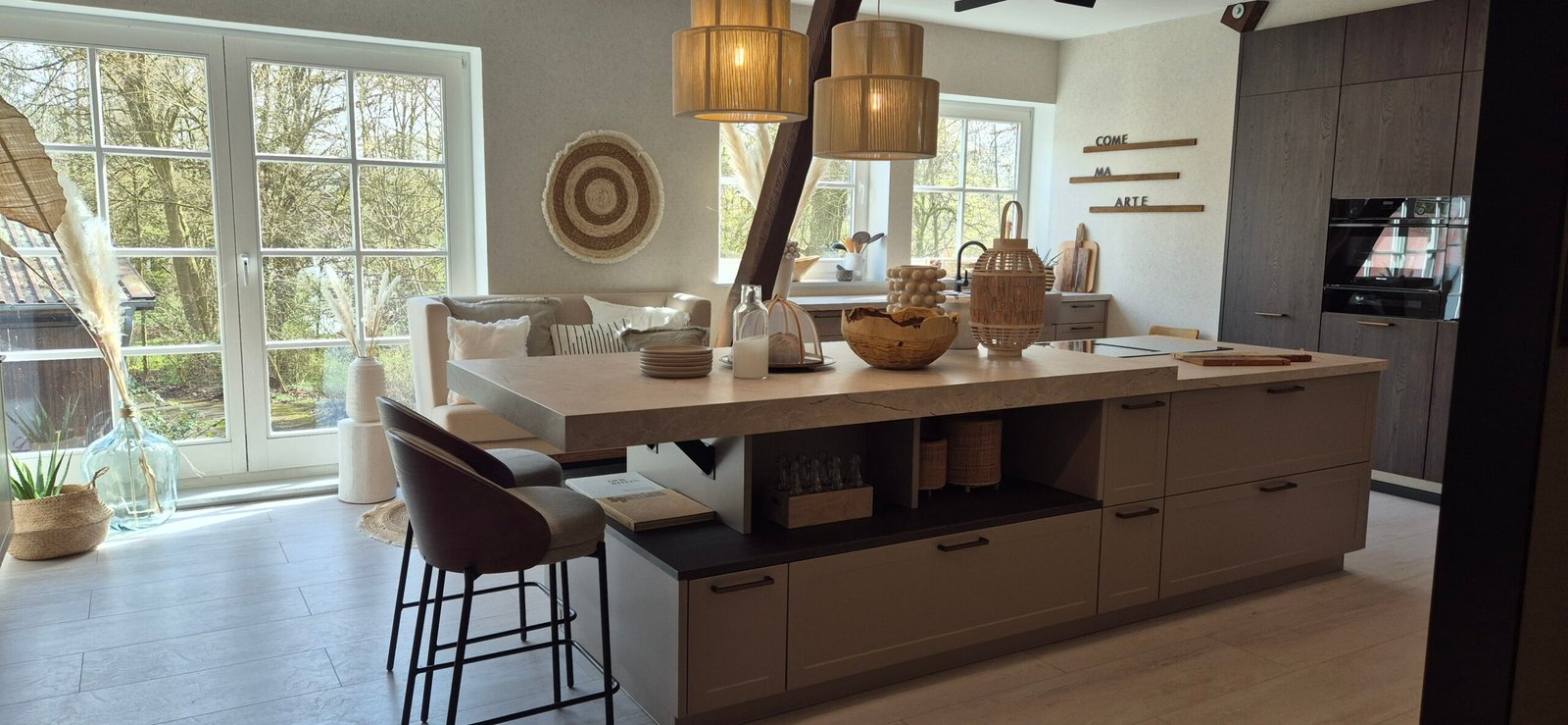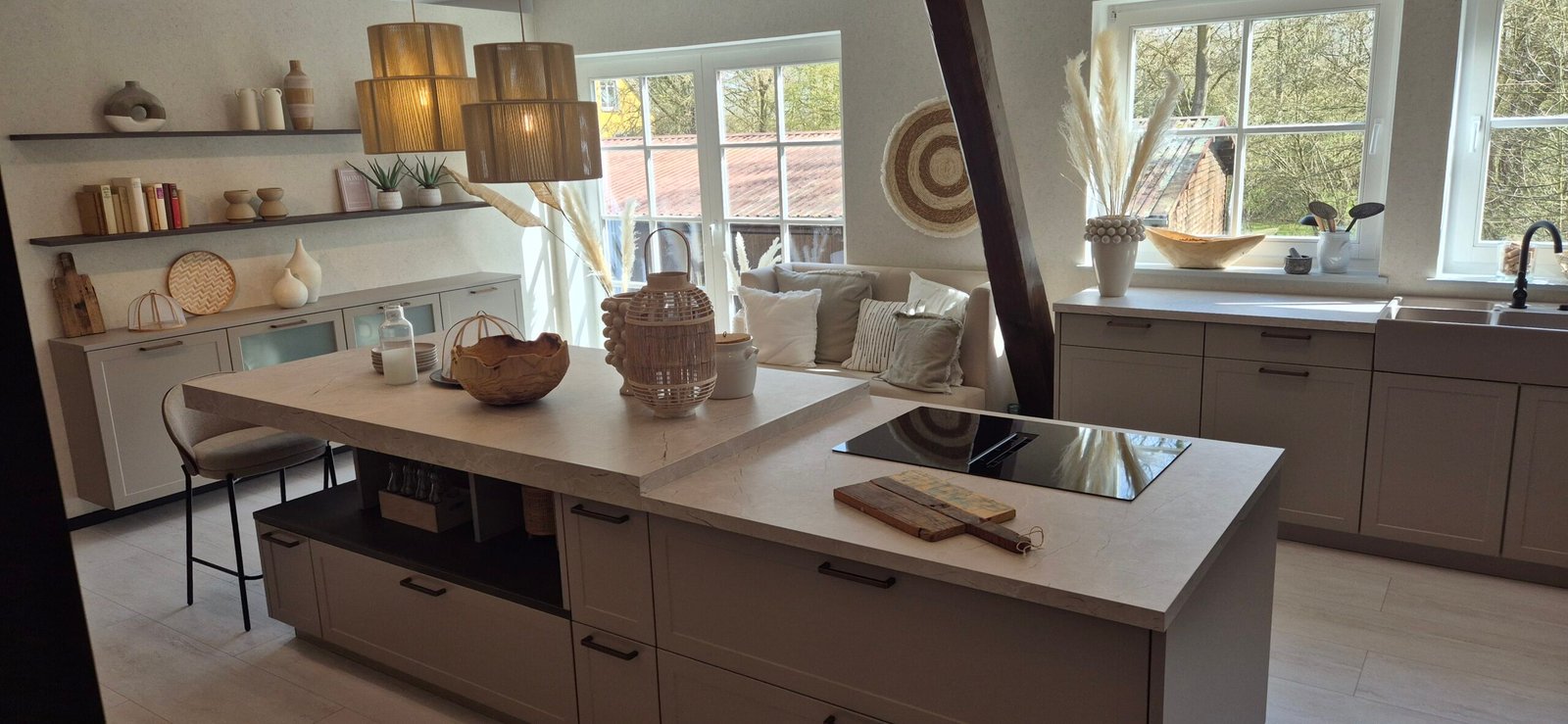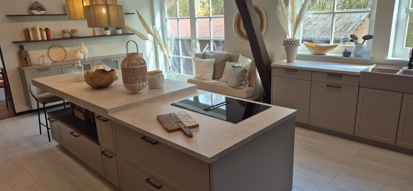 Diese Ausstellungsküche wurde in Hannover präsentiert und zeigt aktuelle Trends im Bereich moderner Küchen mit Holzoptik. Die geräucherte Eiche sorgt für Tiefe und Charakter, während die Greige-Fronten eine ruhige und zeitlose Basis bilden.