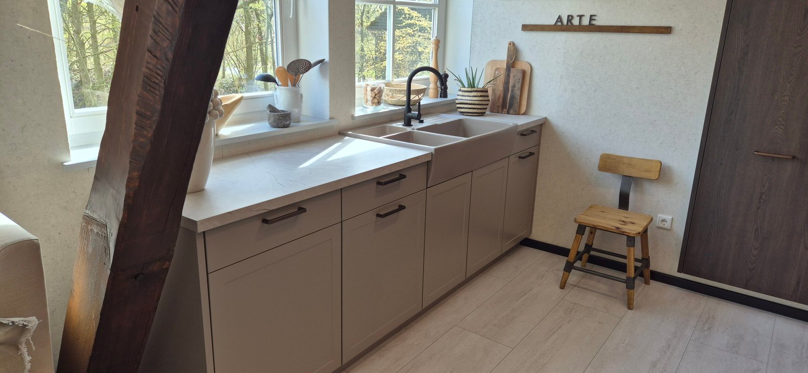 Die moderne Burger Küche Sophie in Greige kombiniert mit der edlen Holzoptik Marie Eiche Geräuchert überzeugt durch ihre warme und zugleich elegante Ausstrahlung. Die Kombination aus natürlichen Holztönen und dezenten Farbnuancen schafft eine stilvolle und einladende Atmosphäre im Küchenraum.